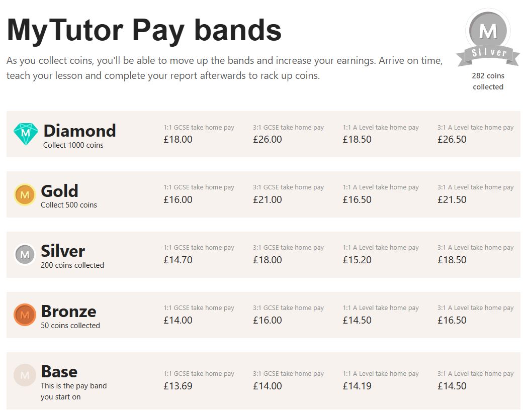 A good example of this for an entry-level company is MyTutor. While their base pay starts rather low, at £13.69 per hour (approx. $18 USD), as teachers teach more classes they collect coins and work up to £26.50 ($35 USD) per hour.